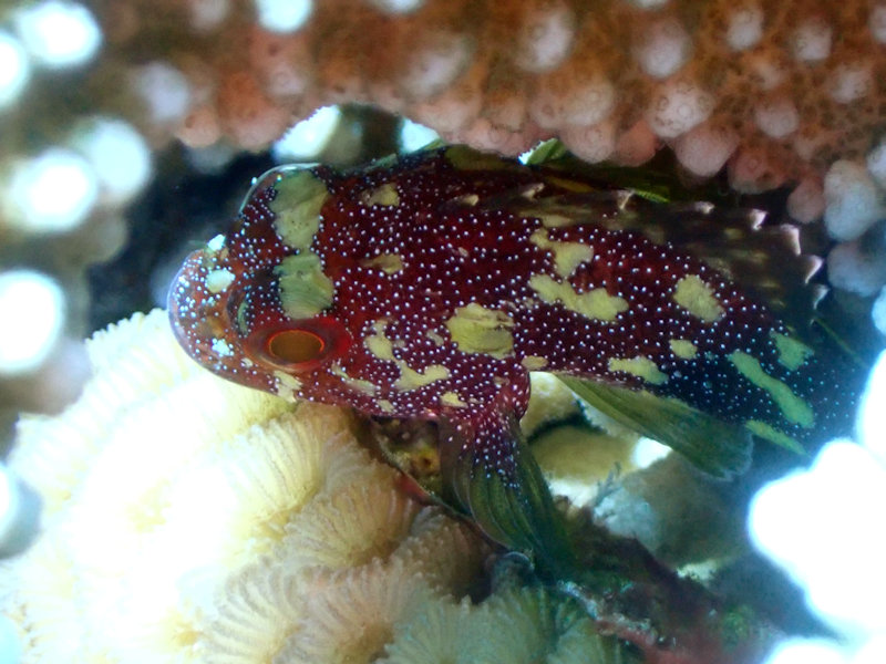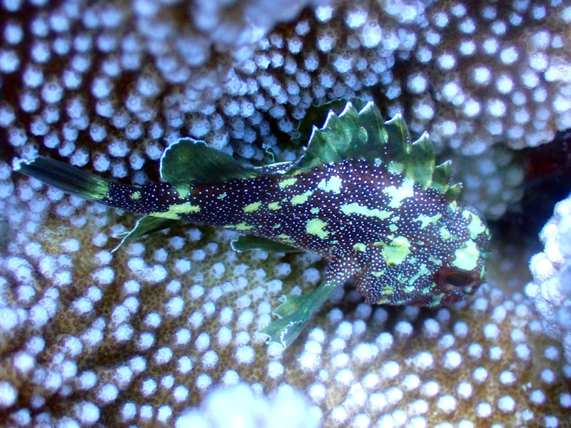 | フサカサゴの種類は、体のどこかにひらひらのフサがあるはずなのに見えないなあ。サンゴのすきまを通るからとれちゃったのかなあ。 |